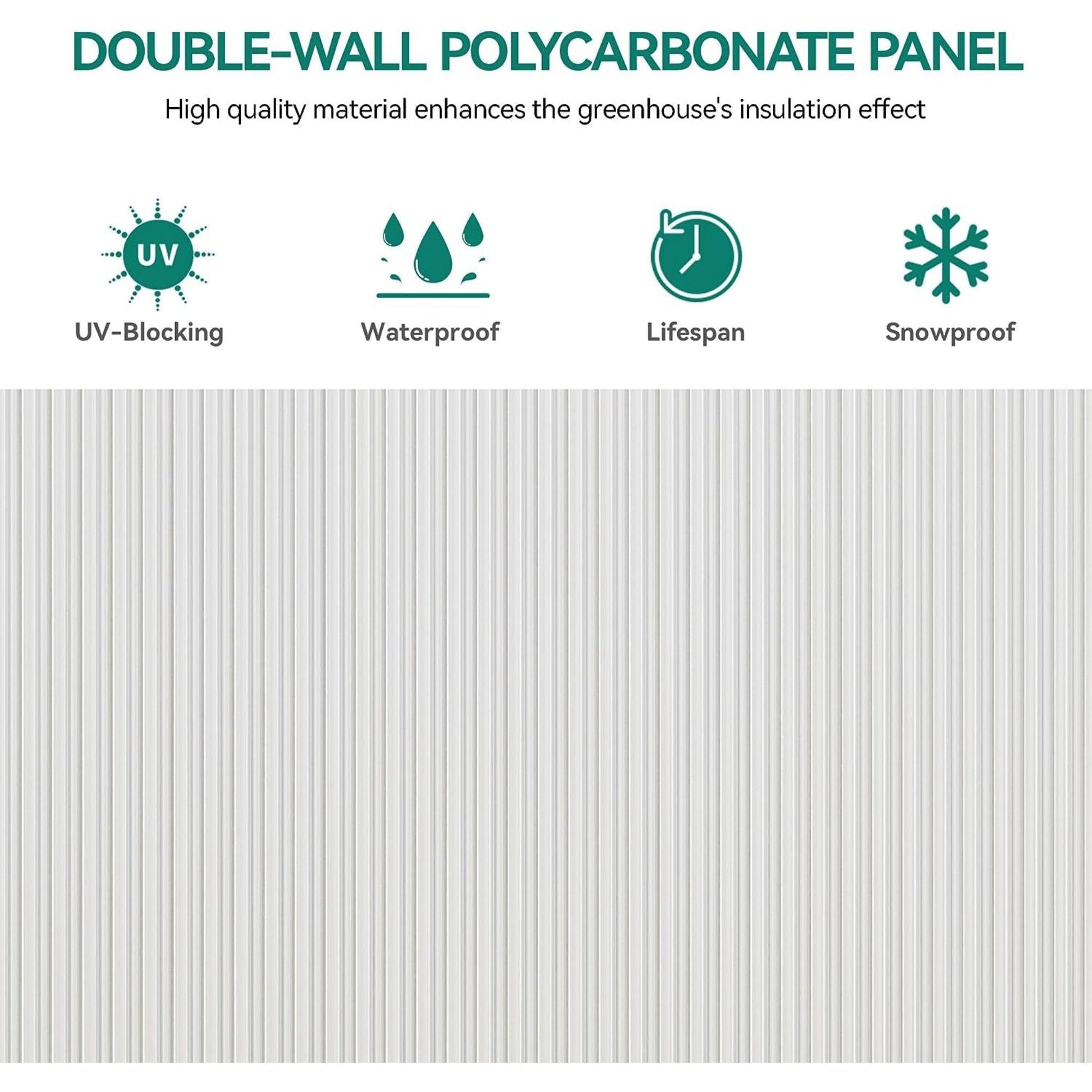 Experience the security of having your plants safely in this amazing Large Polycarbonate Aluminum Greenhouse! The durable aluminum alloy frame and reinforcing rods on the sides, paired with the double-wall polycarbonate boards, ensure superior UV protection. This sturdy greenhouse also has adjustable skylights to ensure optimal ventilation and cooling - ideal for cultivating and protecting plants year-round.