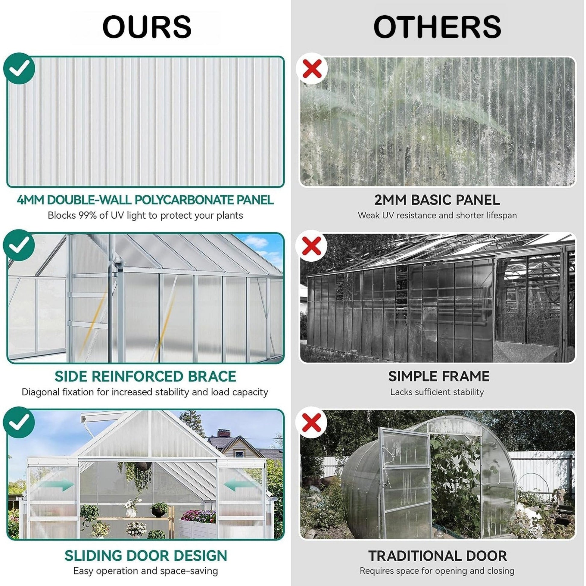 And to get even more out of your purchase it includes expansion screws to make sure it stays attached to the ground for added stability. You'll love that it also has a tilt angle design to effectively resist high winds and improve drainage efficiency. Whether your looking to upgrade your garden or backyard this season, make the choice you’ll be proud of - invest in our Large Heavy Duty Polycarbonate Aluminum Greenhouse With Sliding Doors And Vents today!